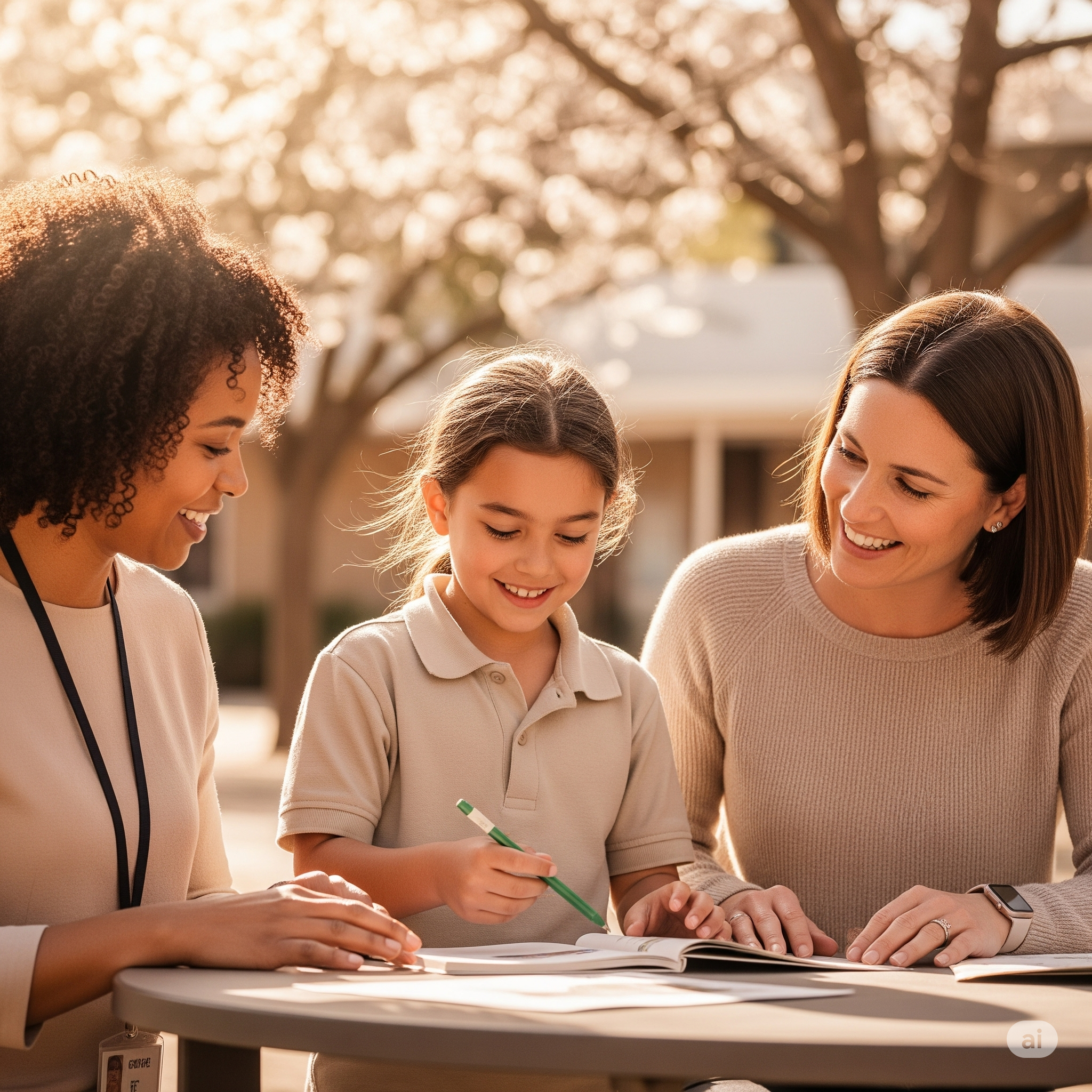 School age child with a parent and educator looking at a piece of paper together
